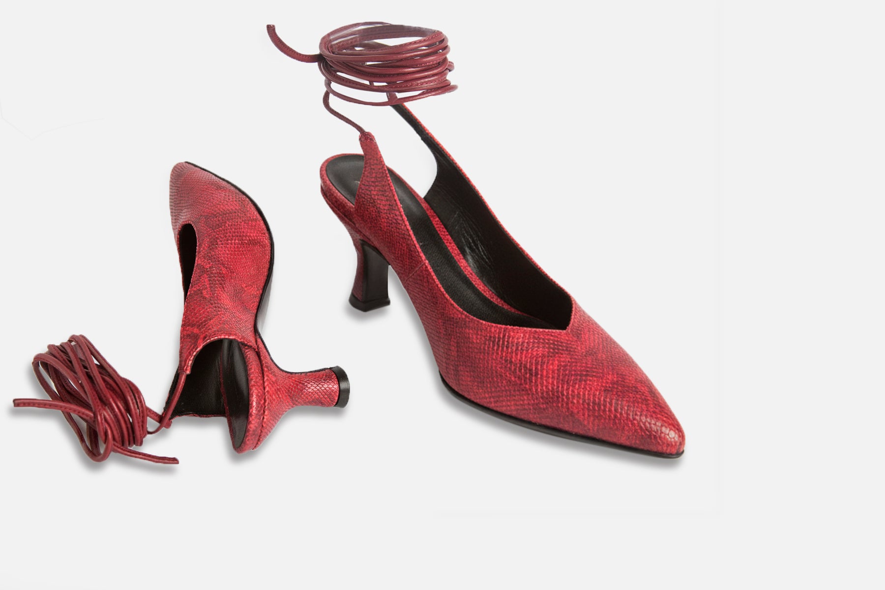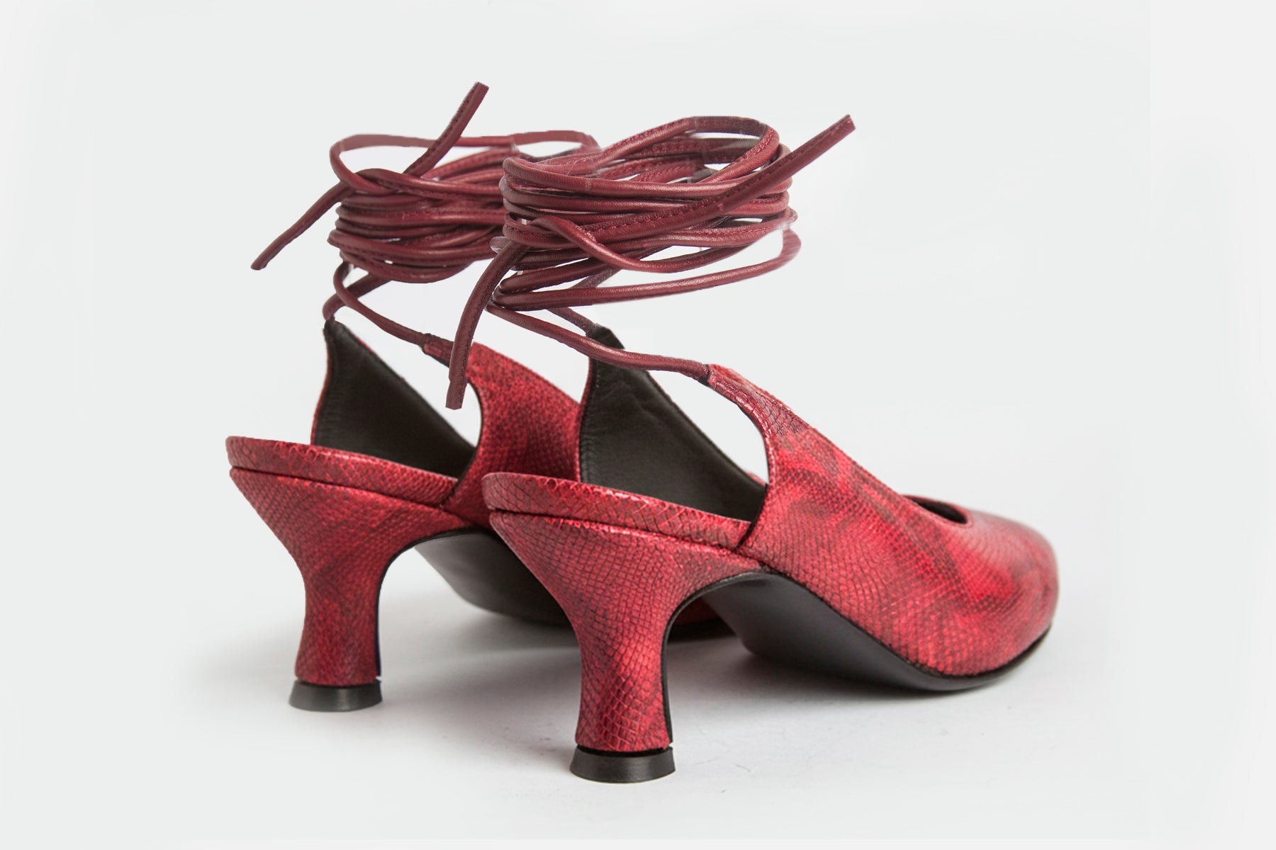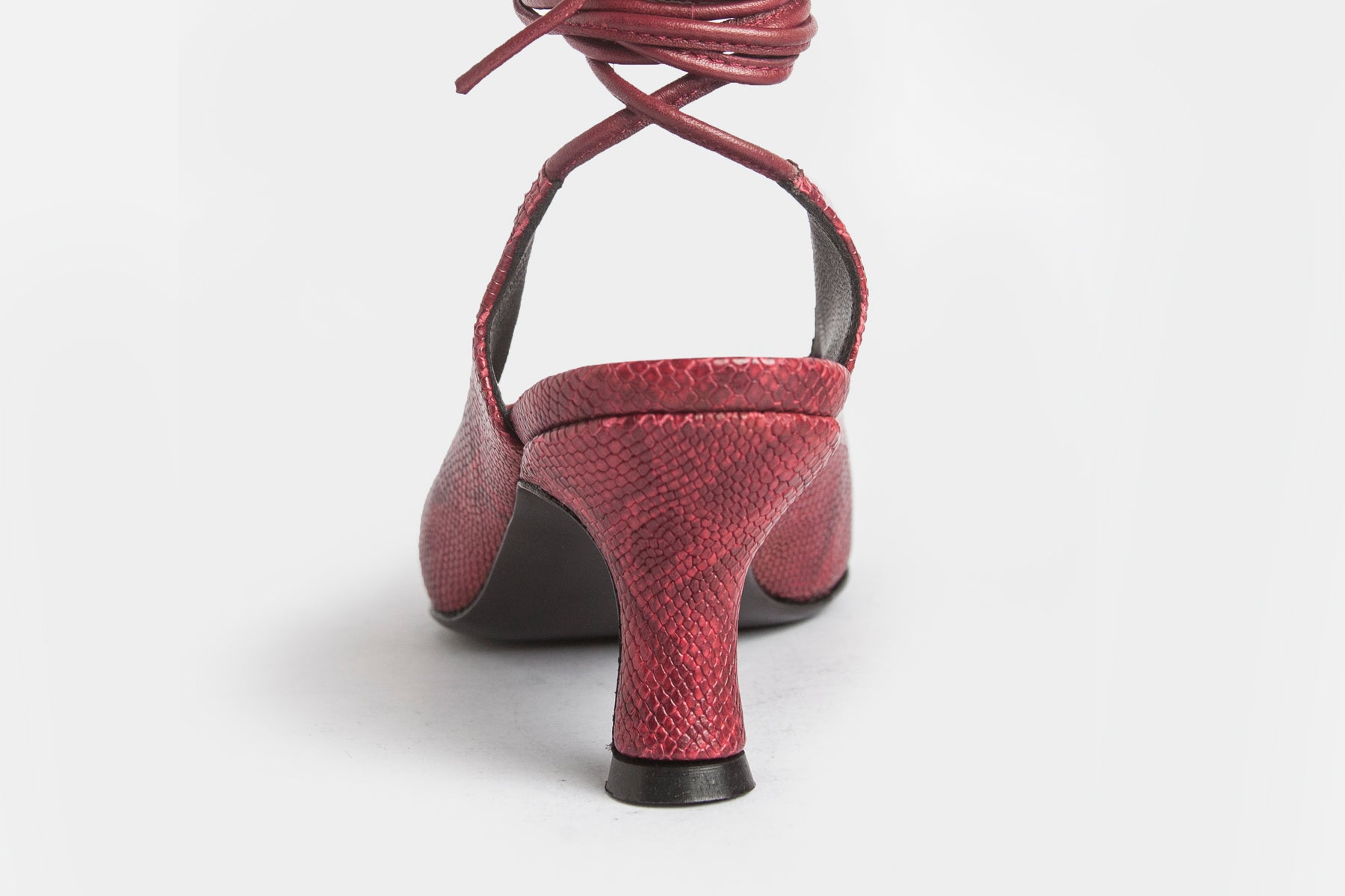Zapato hecho en cuero vacuno simil print iguanita. Forrado en cuero de cabra y con altura de 5cm. Suela de cuero y tira larga para usarla en el tobillo o treparla en las piernas.