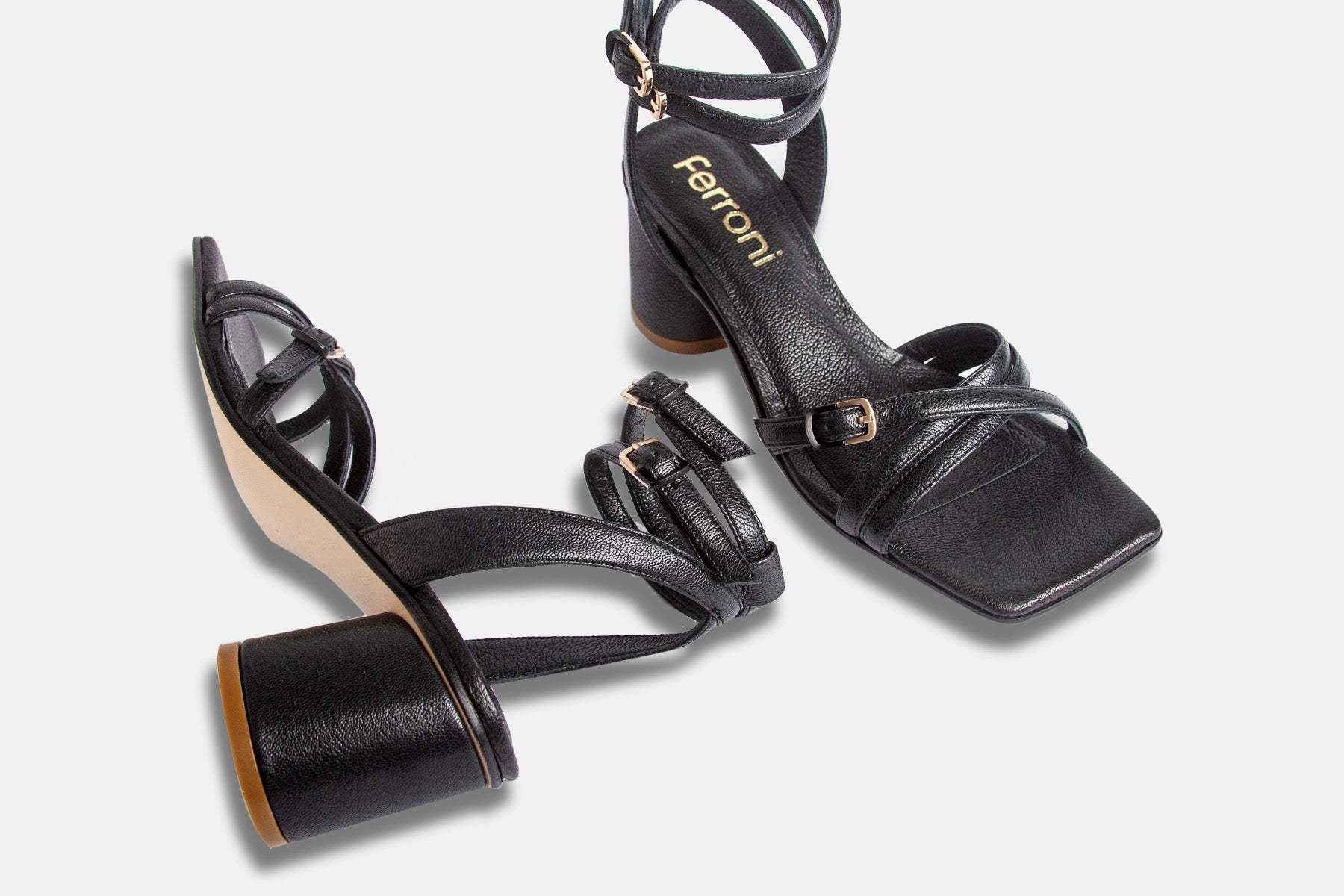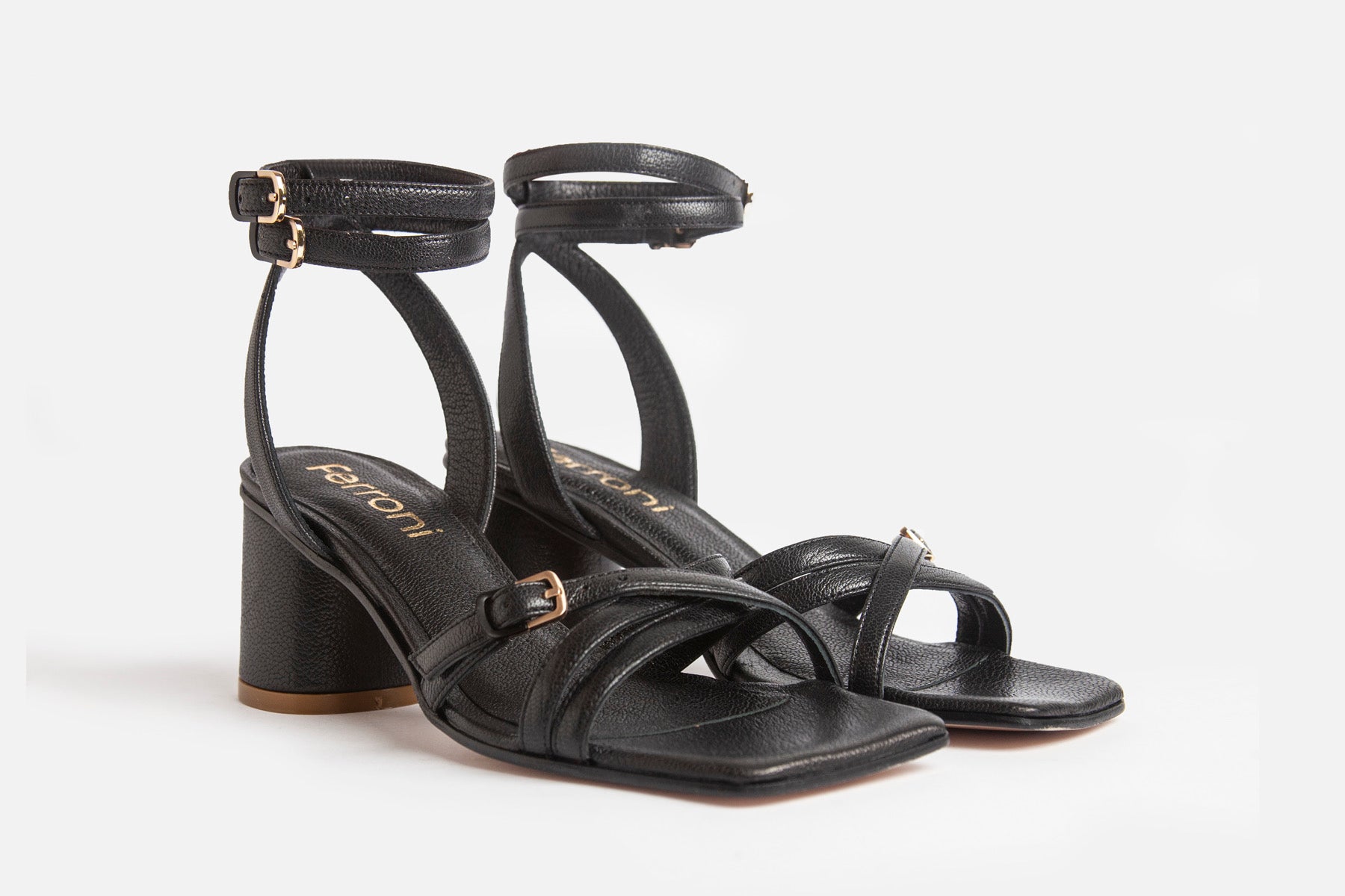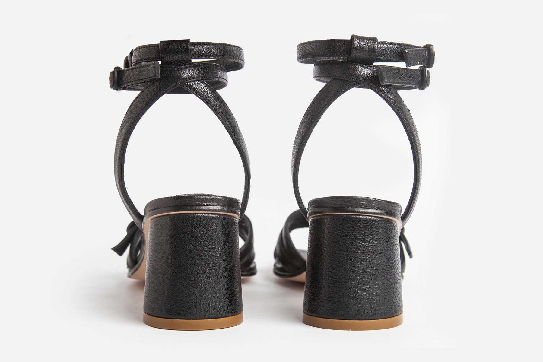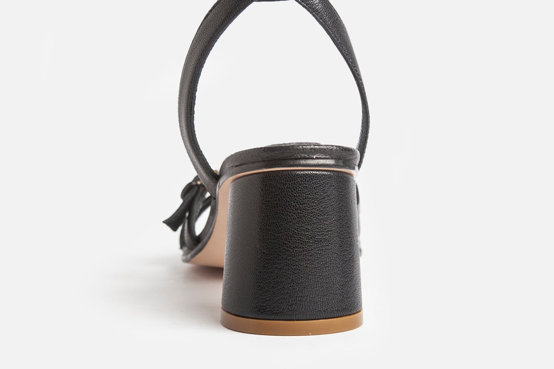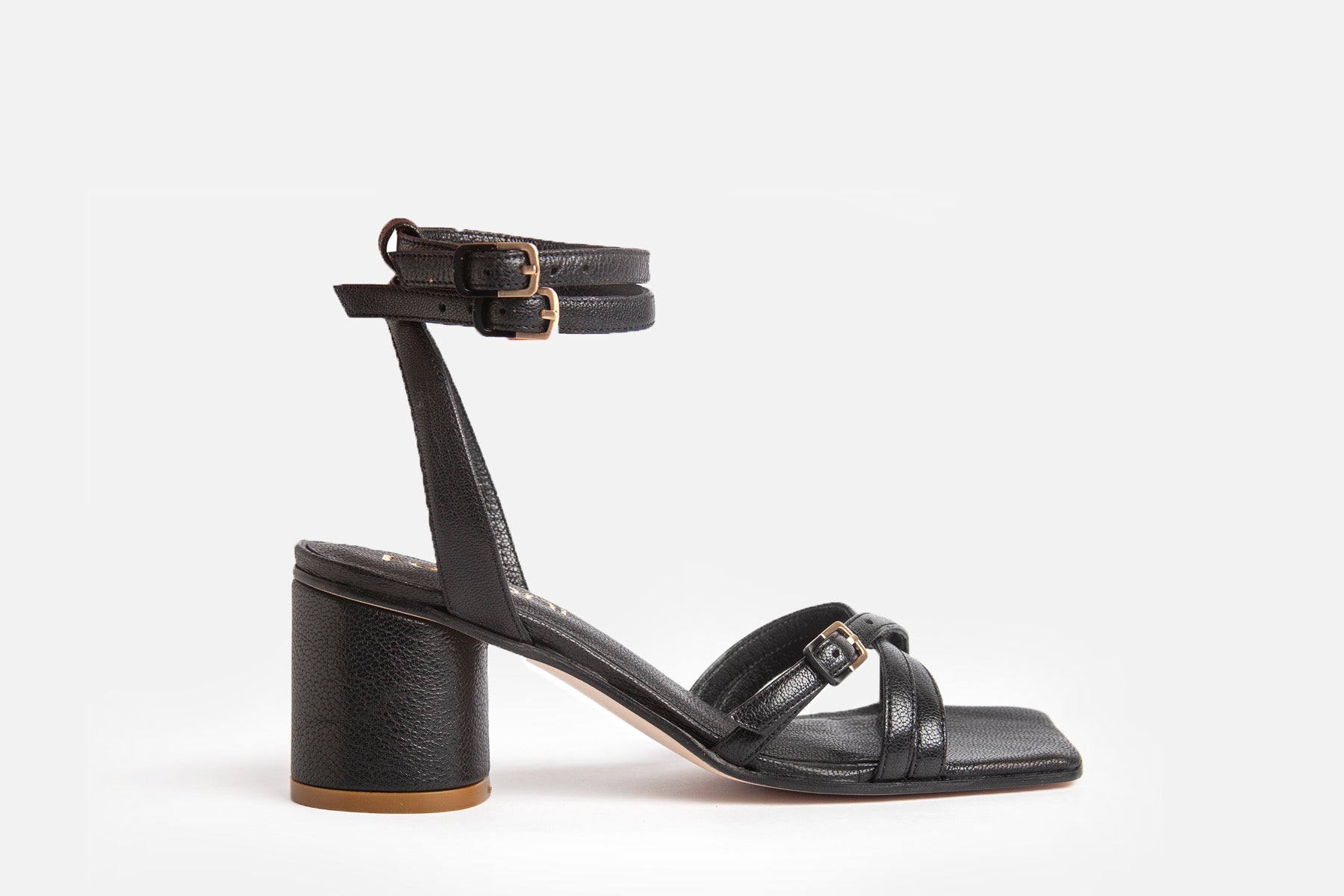Sandalia hecha en cuero de cabra negro. Altura 5cm, forrada en cuero, plantilla amplia y acolchada, suela de cuero.