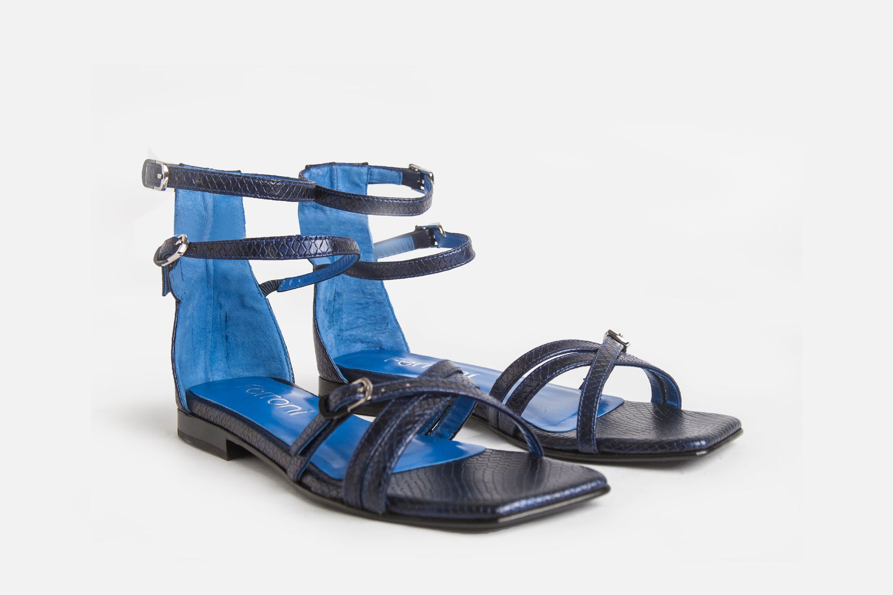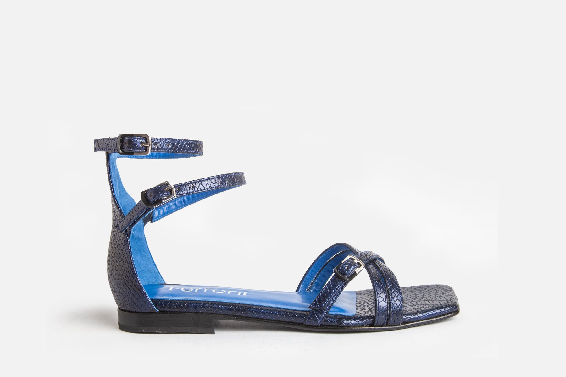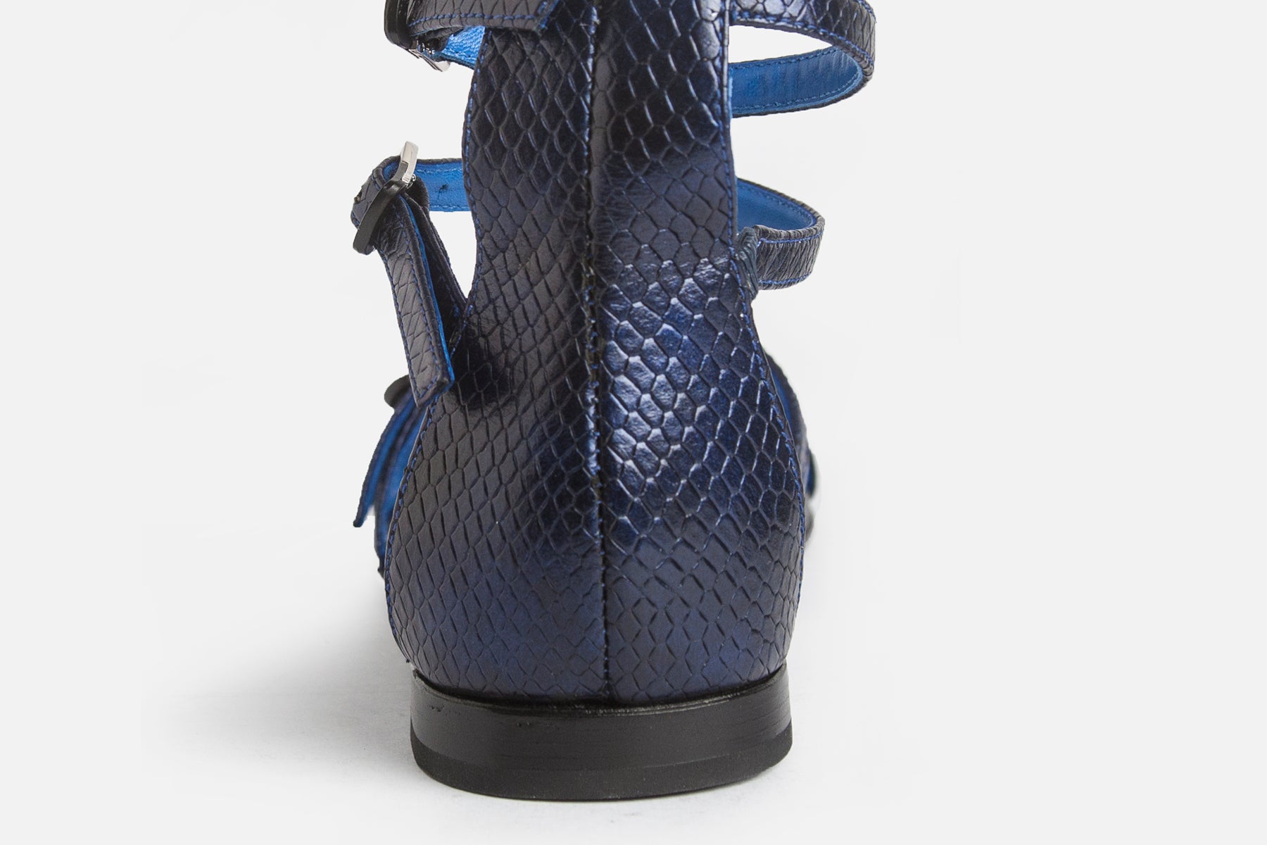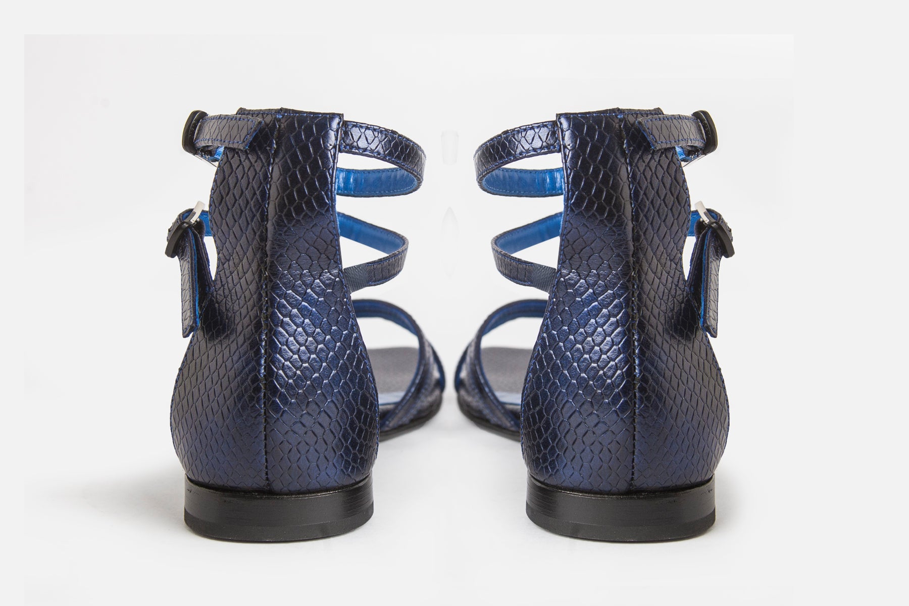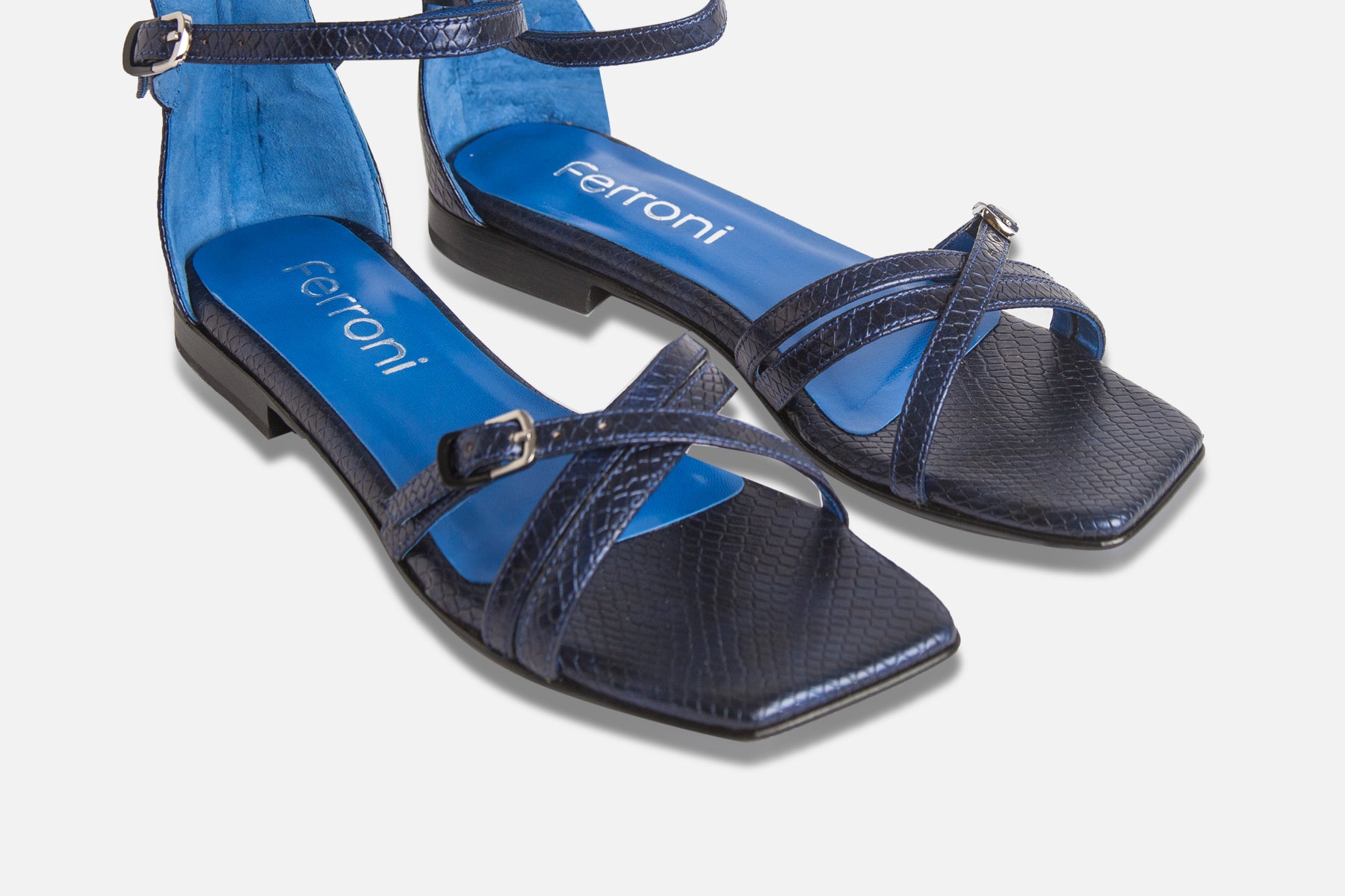 Sandalia flat hecha en cuero simil piton en color azul. Forrada en cuero de cabra a tono.